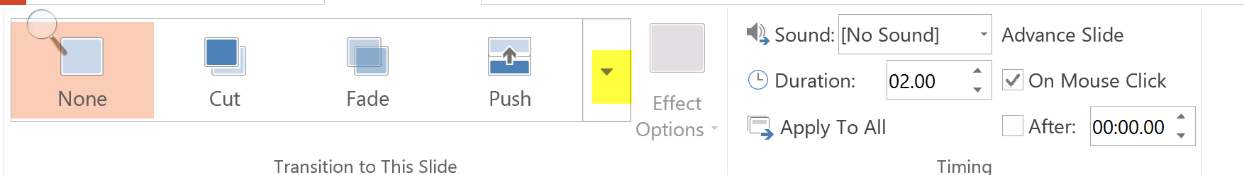 Step 1: I am going to the top of my screen in PowerPoint now – and I am going to click on transitions, as shown below:
